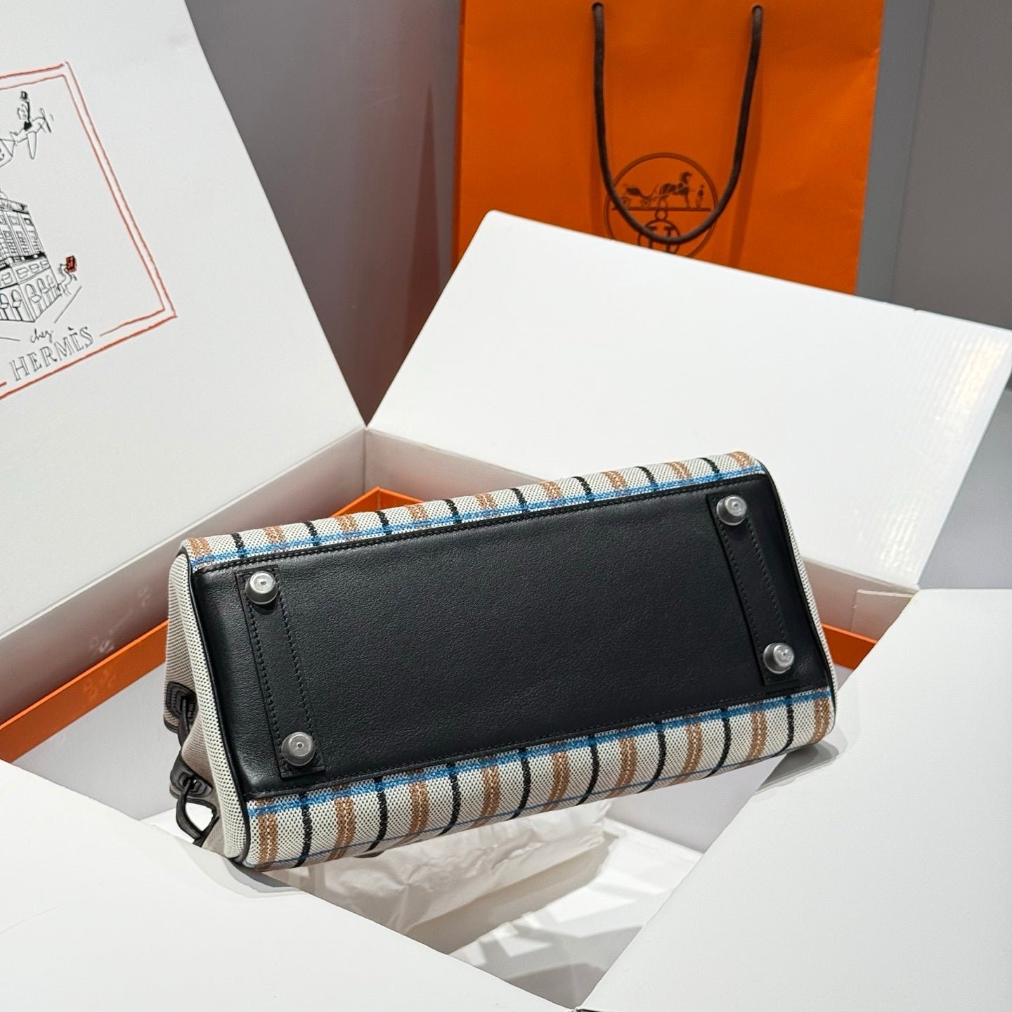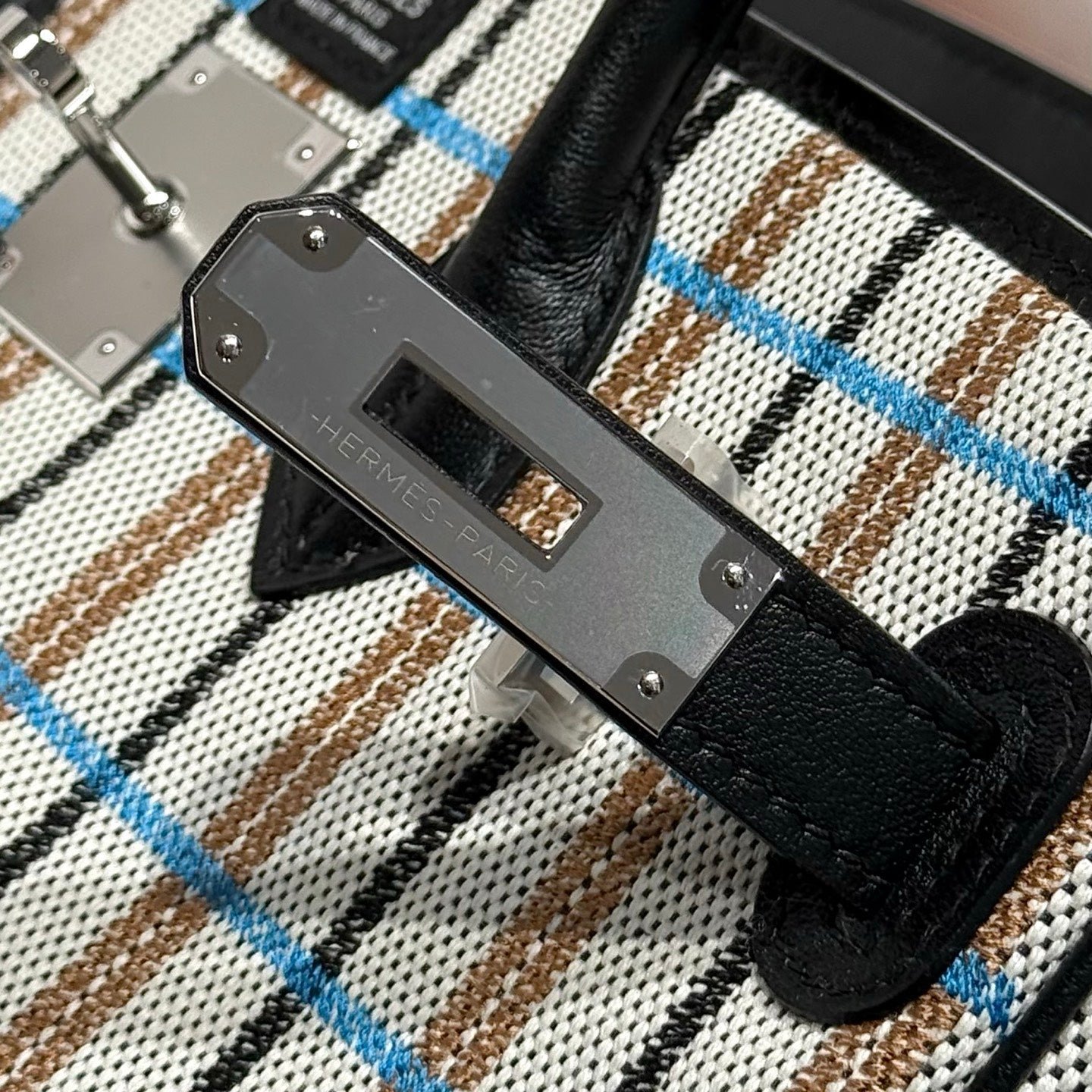 BIRKIN SHOULDER 29 IN BLACK CALFSKIN CRU/NOIR/FAUVE/NOIR/BLEU ZANZIBAR EMBROIDERY PLAID CANVAS