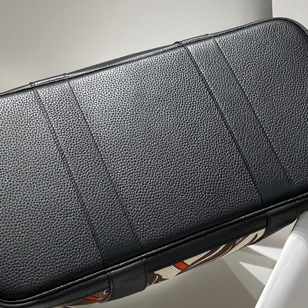 GARDEN PARTY 36 IN BEIGE ORANGE AND BROWN TOILE H CANVAS BLACK CALFSKIN HORSE TOTEM PRINT