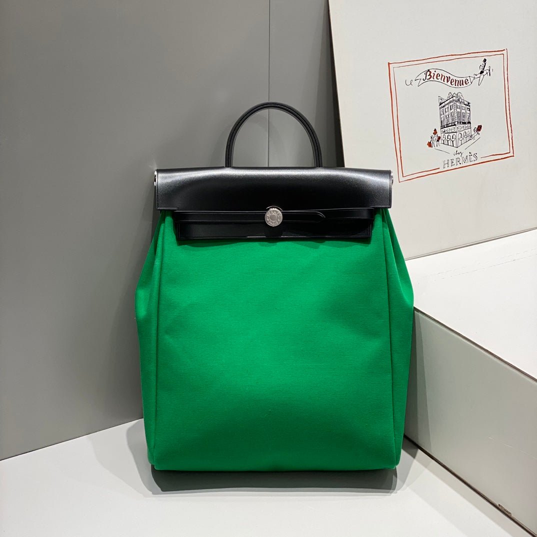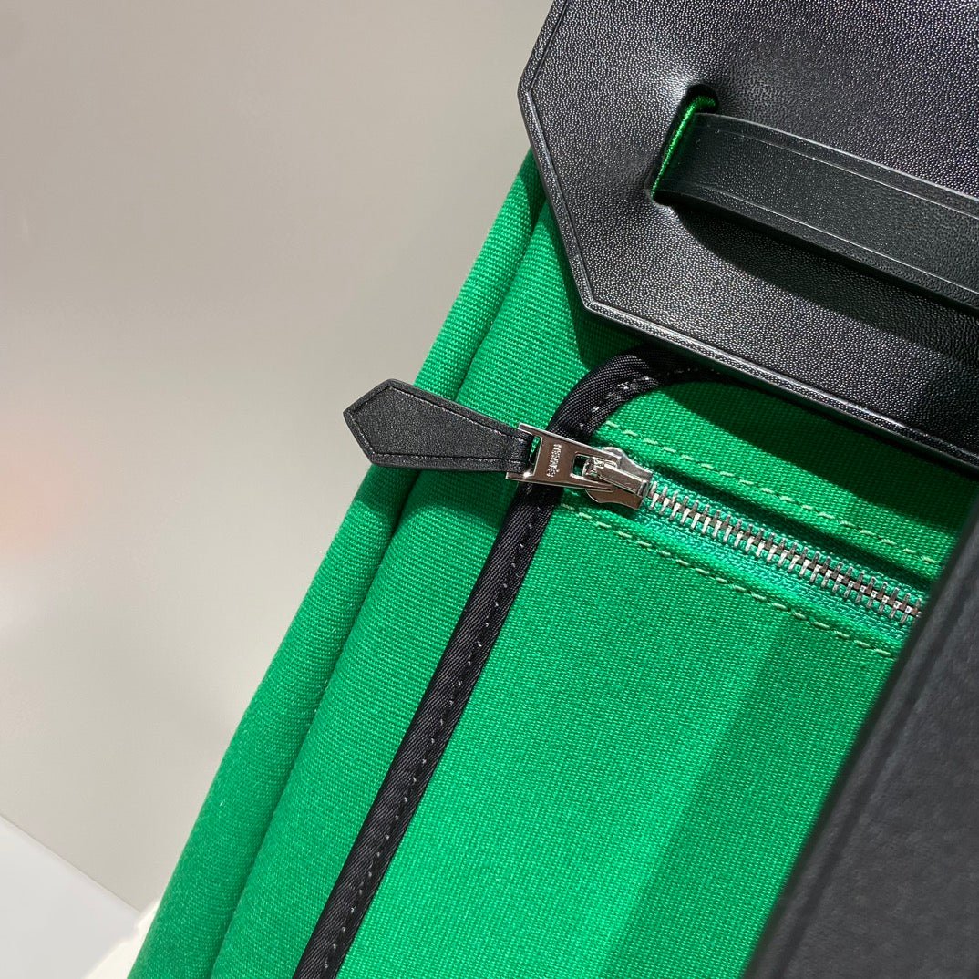 HERBAG A DOS ZIP RETOURNE BACKPACK 29 IN GREEN CANVAS AND BLACK CALFSKIN