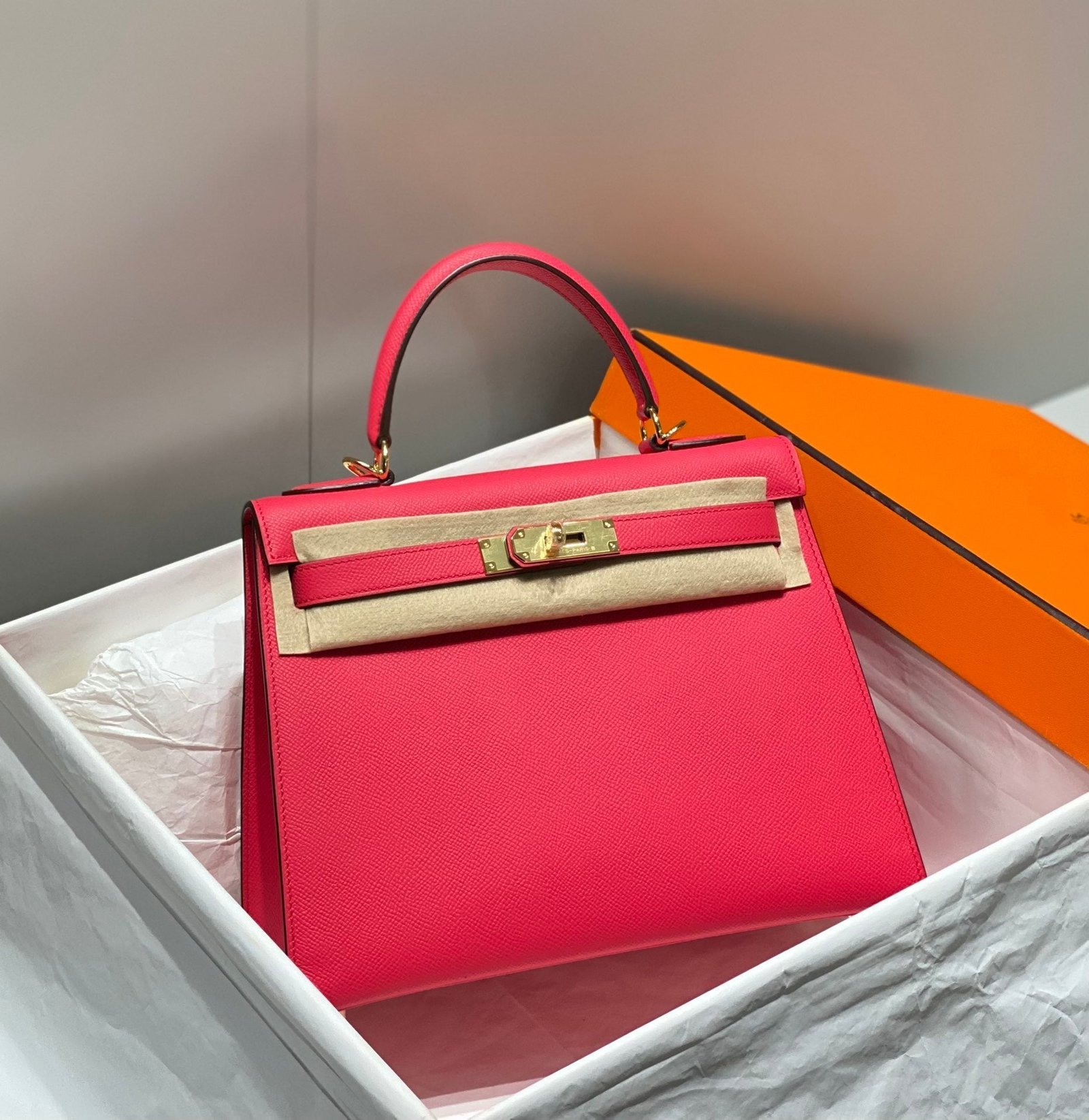 KELLY 28CM IN ROSE TYRIEN SWIFT CALFSKIN GOLD HARDWARE